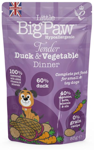 Little Bigpaw täissööt on mõeldud toitumisalaselt väiksematele koertele, kõrgema kalorsuse ja valgusisaldusega. 100% naturaalne ja 60% part. Teraviljavaba ja hüpoallergeenne. Valmistatud õrnast värskest pardilihast – väga toitev, kergesti seeditav ja madala rasvasisaldusega. Naturaalsed süsivesikud: Kartul, roheline hernes ja porgand optimaalse energia ja tervisliku seedimise tagamiseks. Vajalikud vitamiinid ja mineraalid: Sealhulgas A-, D-, E- ja B-kompleks tervisliku immuunsüsteemi, tugevate hammaste ja luude jaoks. Oomegaõlid ja -rasvad: hädavajalikud rasvhapped suurepärase naha, liigeste hoolduse ja suurepärase läikiva karvkatte jaoks.