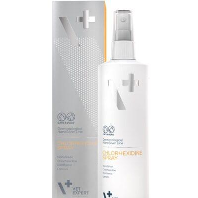 Vetexpert kloorheksidiiniga sprei kassidele ja koertele paikseks nahahoolduseks naha regeneratsioonivõime suurendamiseks. Nanohõbe kiirendab paranemist, toetab naha uuendamise loomulikke protsesse, rahustab